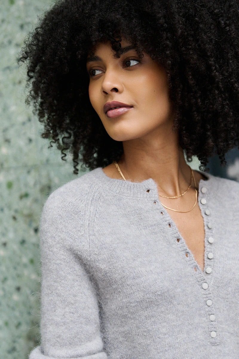 Dieser Pullover ist die Definition von sanftem Chic. Gefertigt aus einer luxuriösen Alpakamischung und Wolle, bietet er maximalen Komfort. Die leicht ballonförmigen langen Ärmel liegen voll im Trend. Am Rundhalsausschnitt sorgt eine dezente Knopfleiste mit Ton-in-Ton-Knöpfen für einen eleganten Akzent. Gerippte Abschlüsse runden das zeitlose Design stilvoll ab.