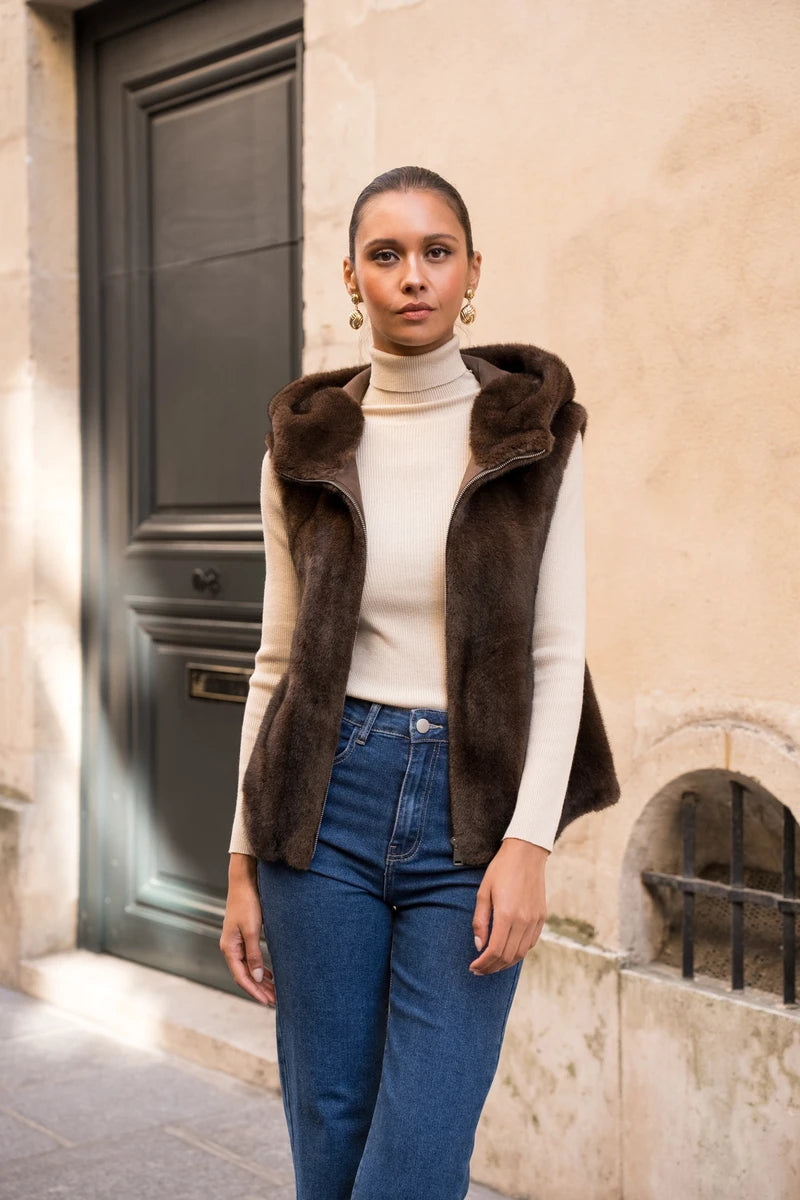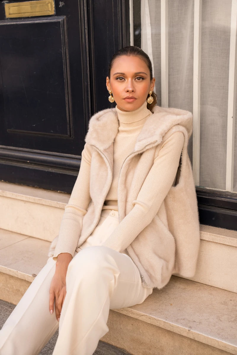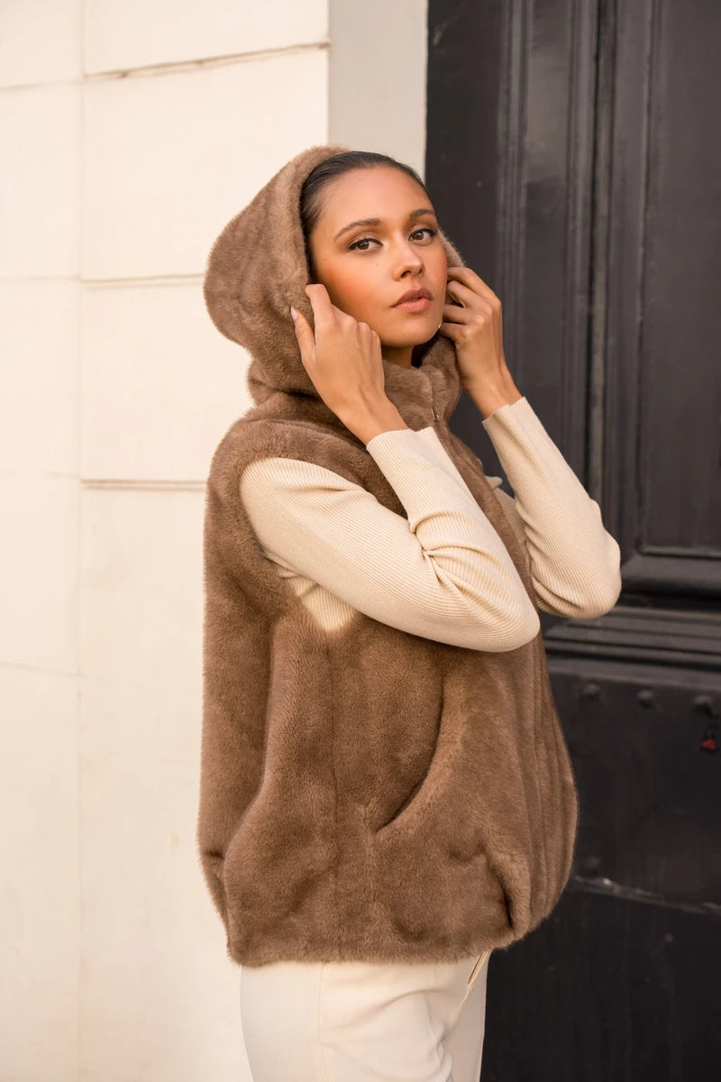 Setze ein modisches Statement mit dieser ärmellosen Kunstpelzjacke. Ihre weiche und flauschige Textur fühlt sich unwiderstehlich an und sorgt für puren Komfort. Die große Kapuze und der gerade Schnitt verleihen ihr eine entspannte Eleganz, während der dezente Reißverschluss einen makellosen Look garantiert. Trage sie über einem langärmeligen Top oder Pullover, um deinem Outfit sofort eine luxuriöse und trendige Note zu verleihen.