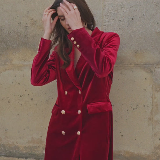 Ein Key-Piece für die moderne Garderobe: Dieses Blazer-Kleid aus edlem Samt vereint maskuline Struktur mit femininer Eleganz. Die doppelreihige Knopfleiste mit markanten goldenen Metallknöpfen verleiht dem Look ein luxuriöses Finish und setzt glanzvolle Akzente.