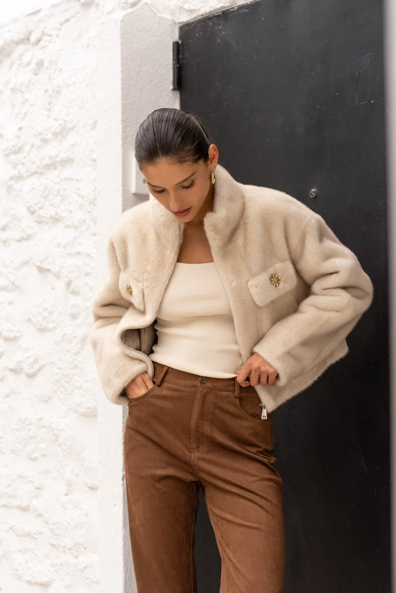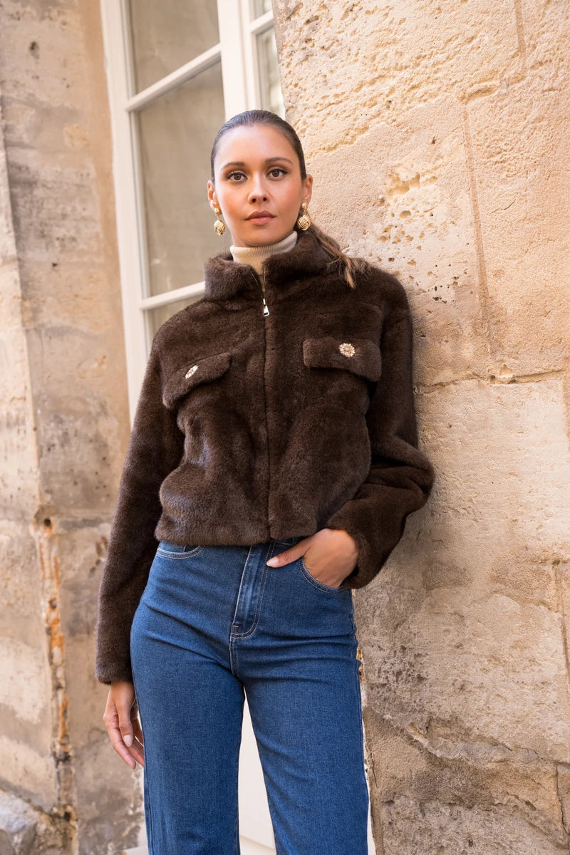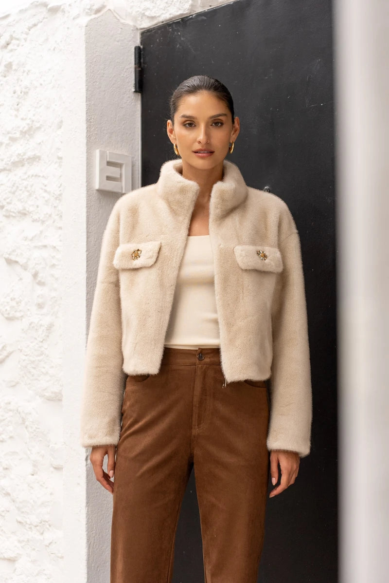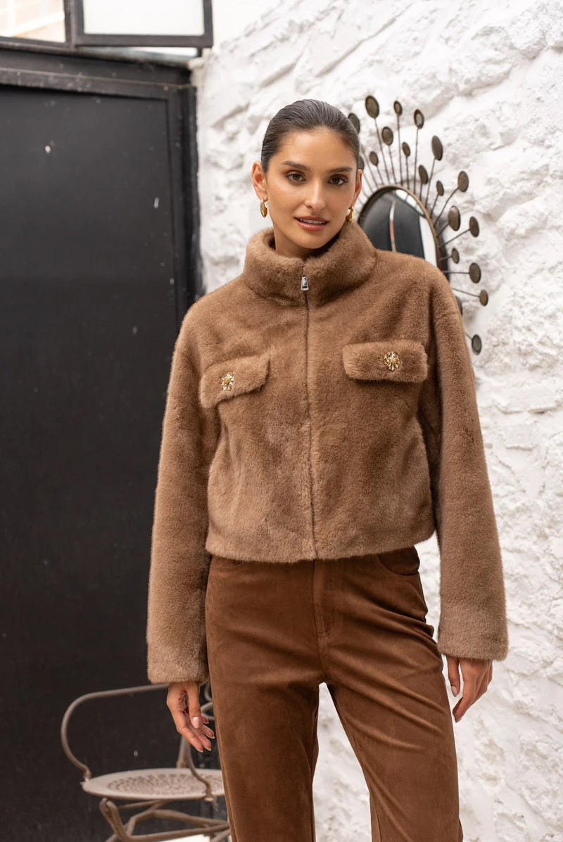 Diese kurze Jacke aus ultraweichem Kunstpelz ist das perfekte Piece für einen eleganten und zugleich gemütlichen Look. Ihr gerader Schnitt und der hohe Kragen sorgen für eine moderne Silhouette, während der Reißverschluss für praktische Lässigkeit steht. Die Klappentaschen mit Schmuckknöpfen sind ein echtes Highlight und verleihen der Jacke einen luxuriösen Touch. Dank der perfekten Verarbeitung ist sie nicht nur ein Hingucker, sondern auch ein echtes Wohlfühlstück.