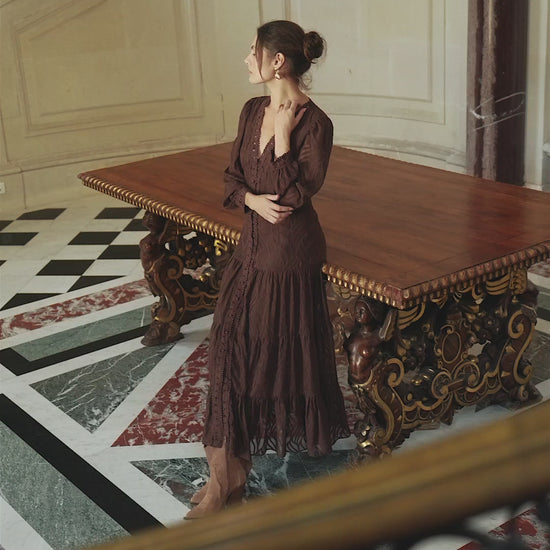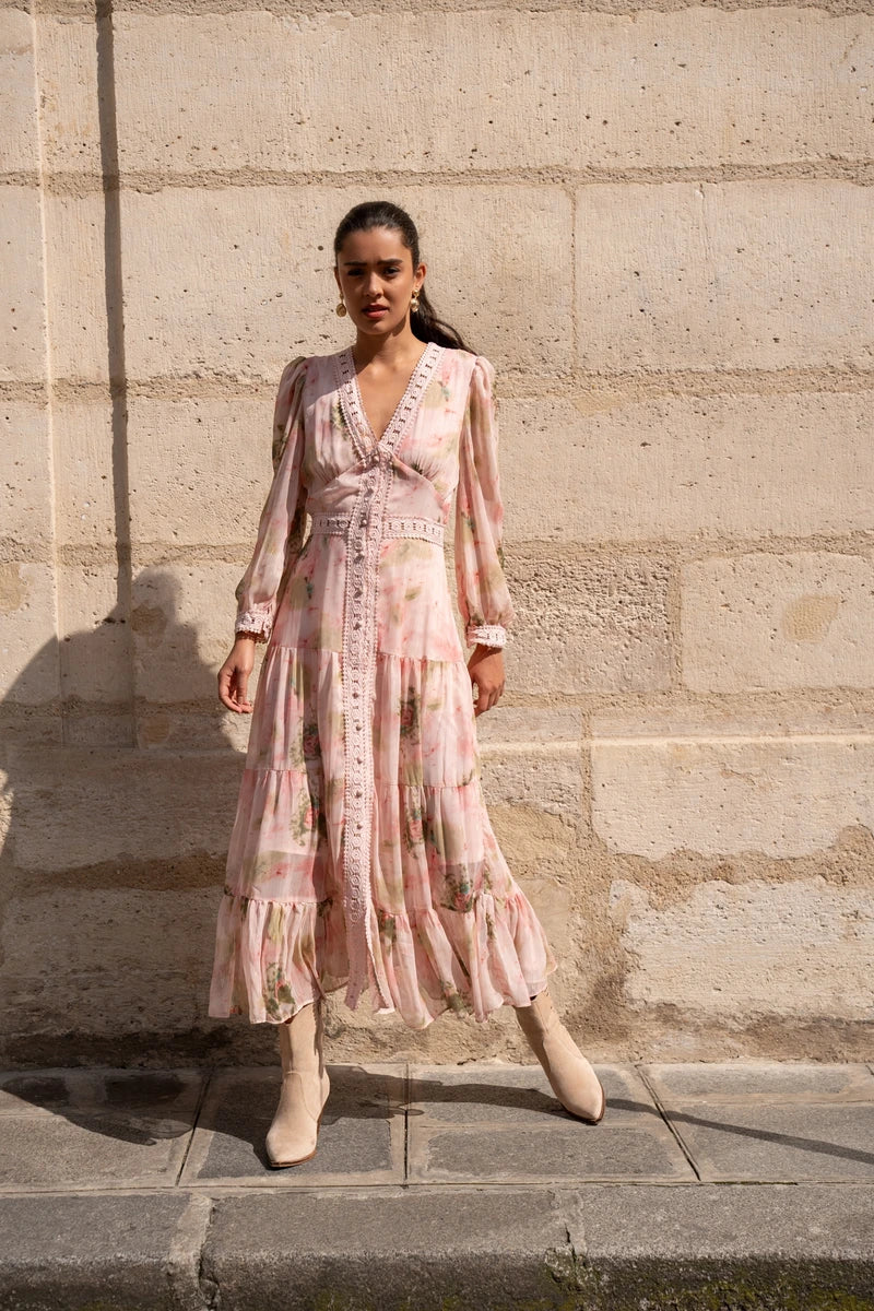Erleben Sie zeitlose Eleganz in diesem bodenlangen Traum aus fließendem Stoff. Der tiefe V-Ausschnitt setzt ein feminines Statement, während die durchgehende Knopfleiste auf der Vorderseite für einen Hauch von Vintage-Charme sorgt. Romantische Rüschen-Applikationen verleihen dem Kleid eine verspielte Dynamik. Lange Ärmel und der weich fallende Stoff umschmeicheln sanft Ihre Figur. Perfekt für Abendveranstaltungen oder gehobene Anlässe – kombinieren Sie es mit filigranem Goldschmuck.