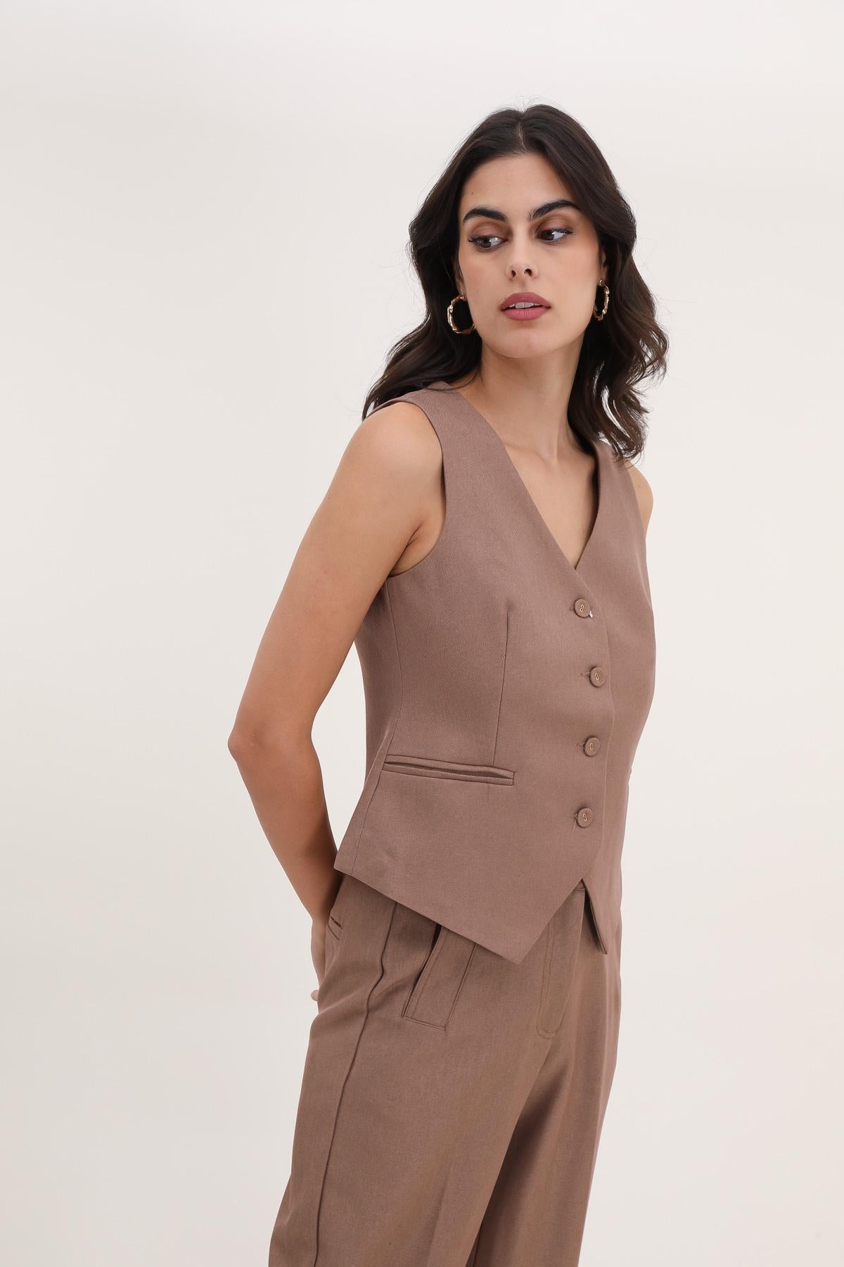 Zeitlose, taillierte Weste im klassischen Design – mit V-Ausschnitt, Knopfleiste und feinen Abnähern für eine feminine Passform. Ideal kombinierbar mit Blazer und Anzughose für einen stilvollen Business-Look oder als elegantes Einzelteil im Alltag. Ein vielseitiges Basic für jede Garderobe.