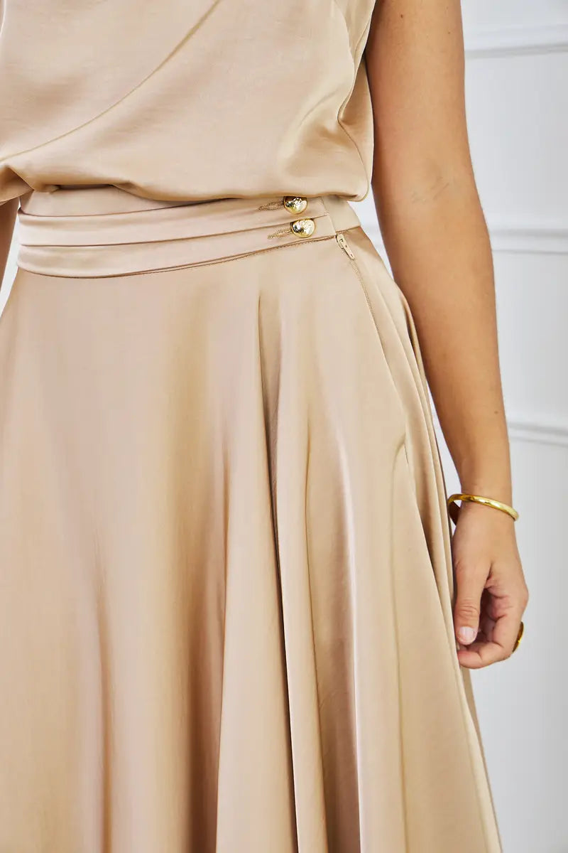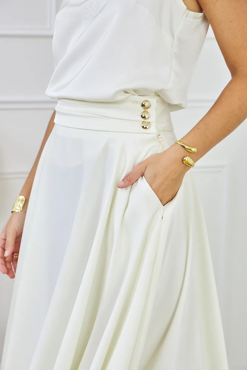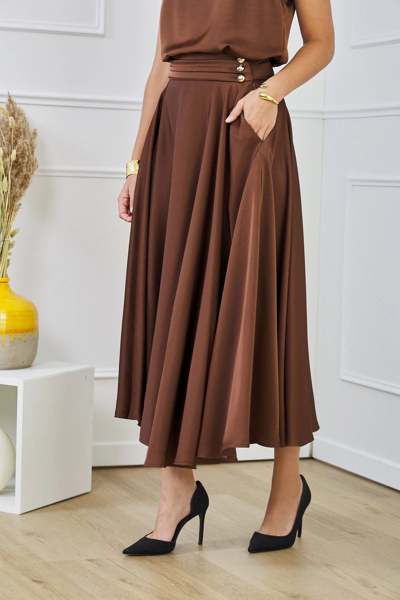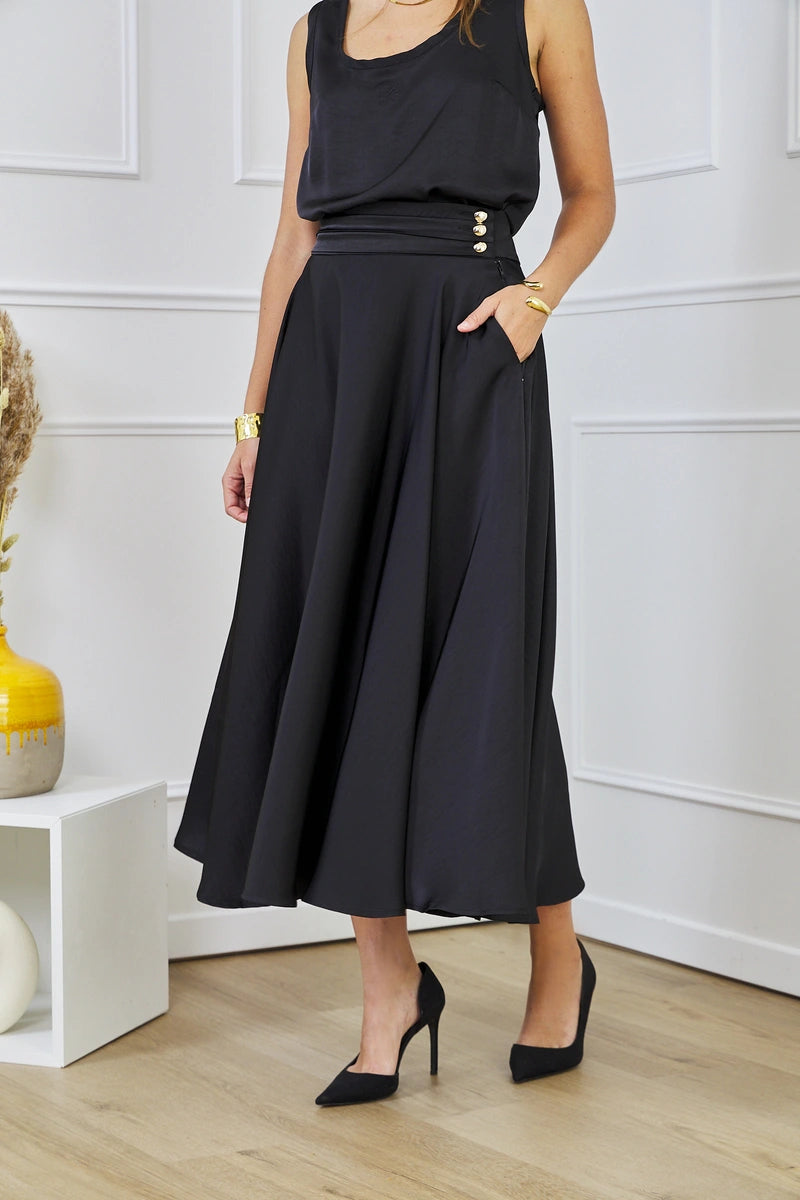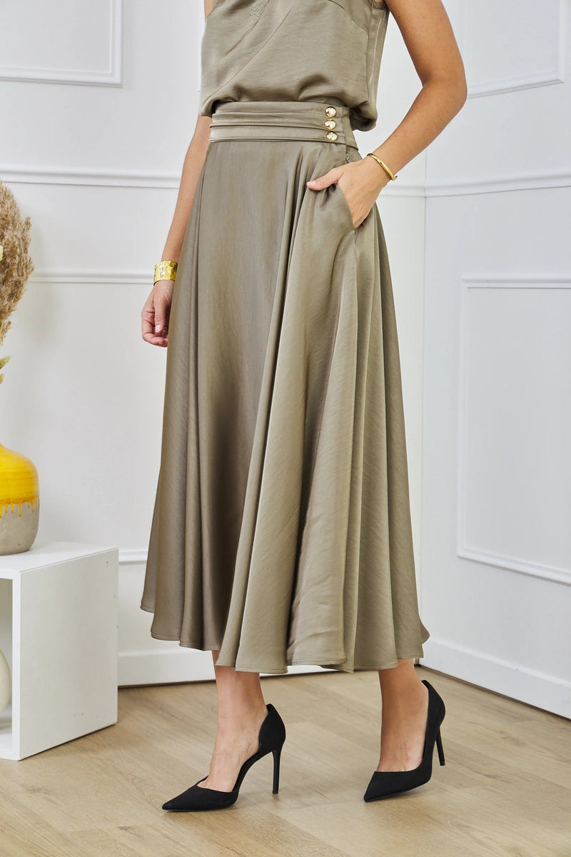Dieser lange Rock ist die perfekte Kombination aus Komfort und Stil. Der klassische A-Linien-Schnitt sorgt für eine elegante Silhouette, während der seitliche Reißverschluss eine saubere Optik garantiert. Das Highlight sind die goldenen Knöpfe an der Taille, die dem Rock einen Hauch von luxuriöser Raffinesse verleihen. Kombiniere ihn mit einem schlichten Oberteil für einen lässigen Look oder mit einer Bluse für ein schickes Abend-Outfit.