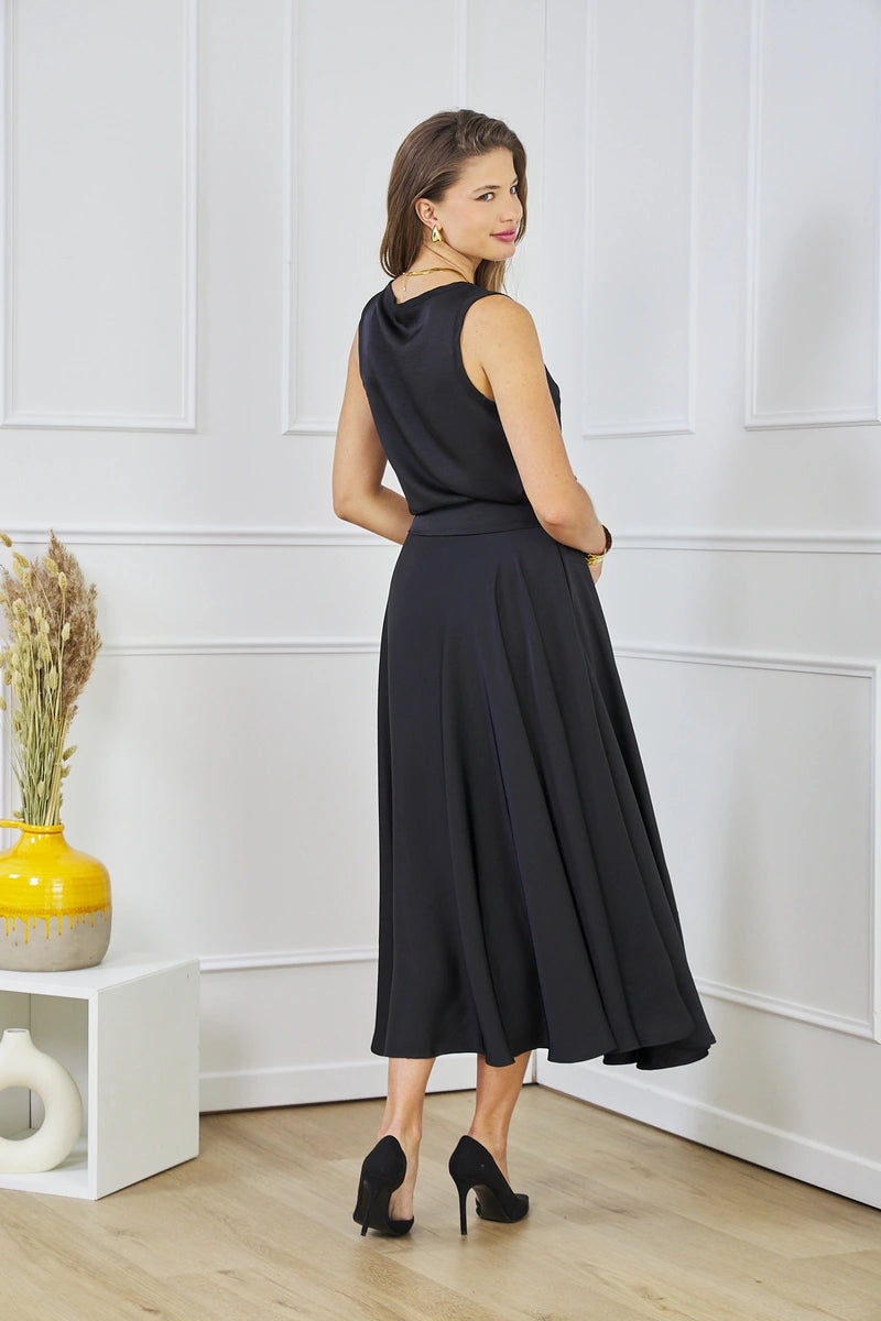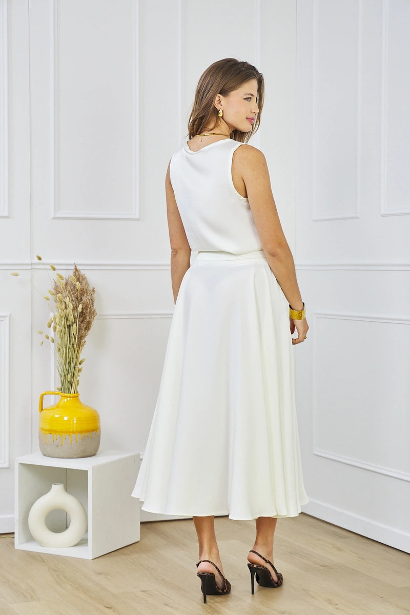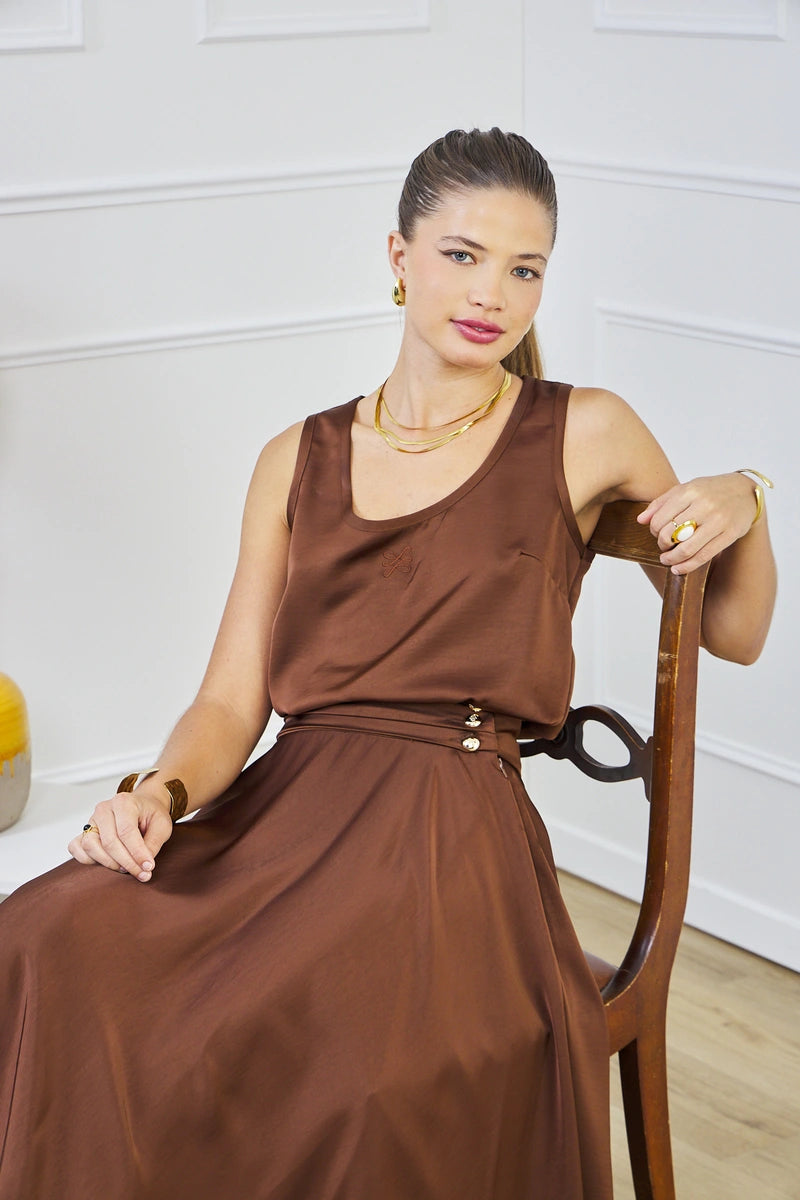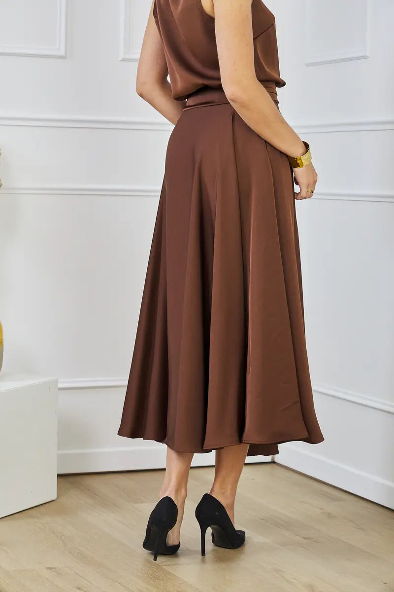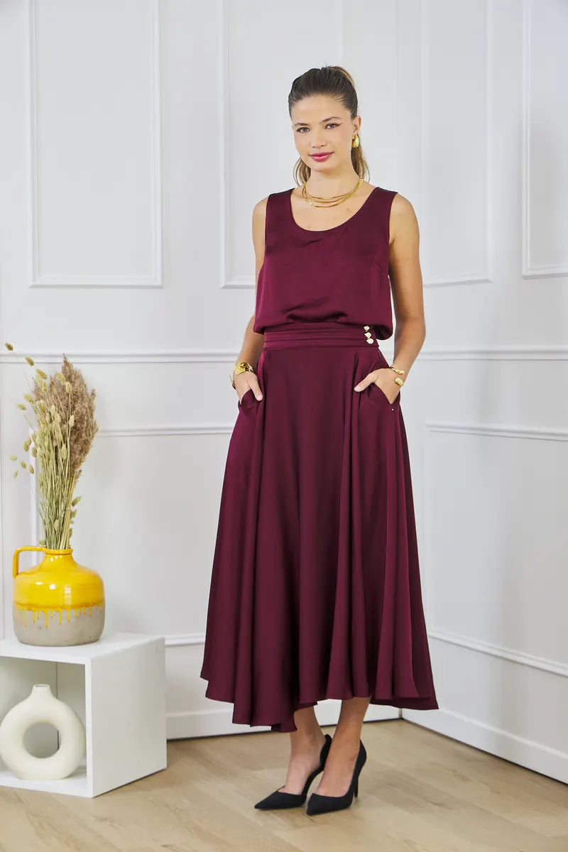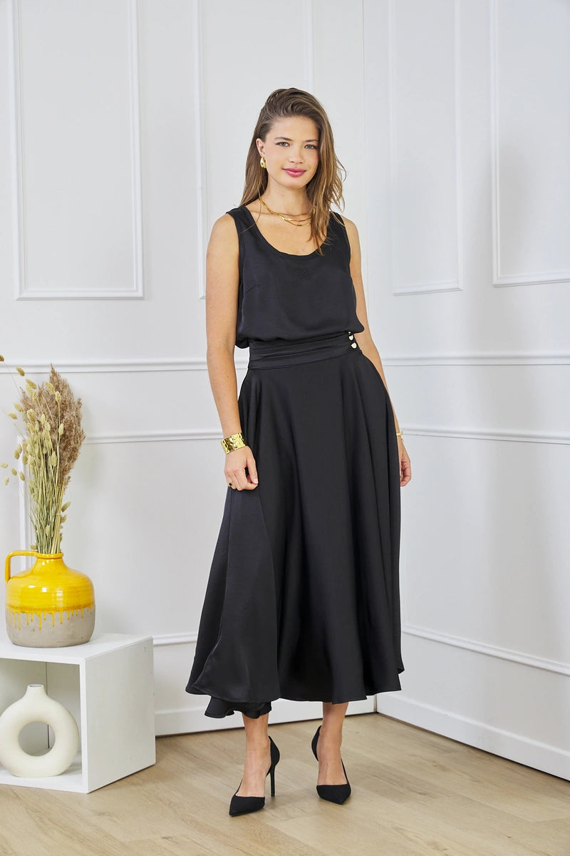 Dieser lange Rock ist die perfekte Kombination aus Komfort und Stil. Der klassische A-Linien-Schnitt sorgt für eine elegante Silhouette, während der seitliche Reißverschluss eine saubere Optik garantiert. Das Highlight sind die goldenen Knöpfe an der Taille, die dem Rock einen Hauch von luxuriöser Raffinesse verleihen. Kombiniere ihn mit einem schlichten Oberteil für einen lässigen Look oder mit einer Bluse für ein schickes Abend-Outfit.