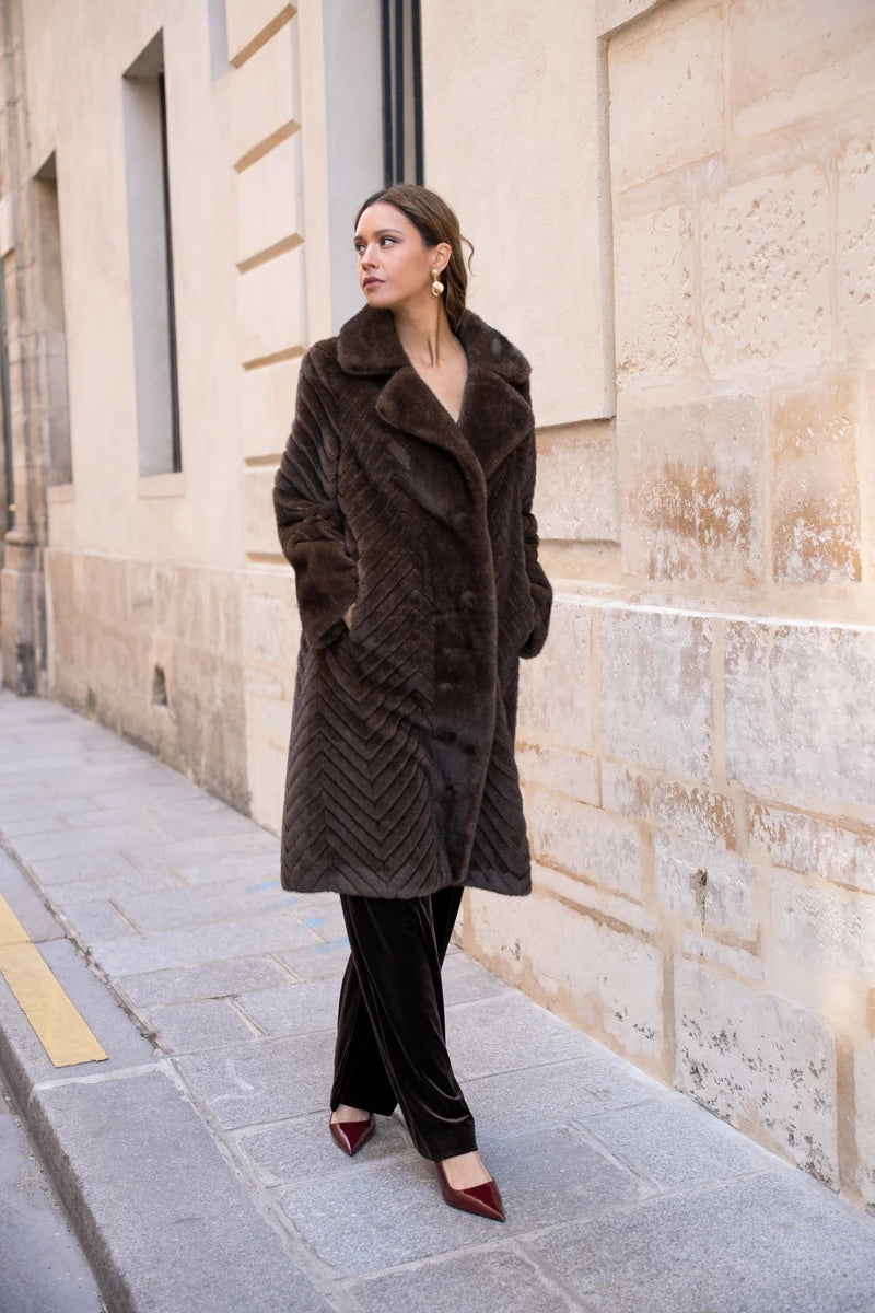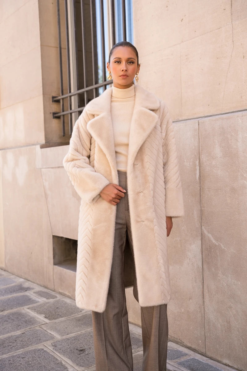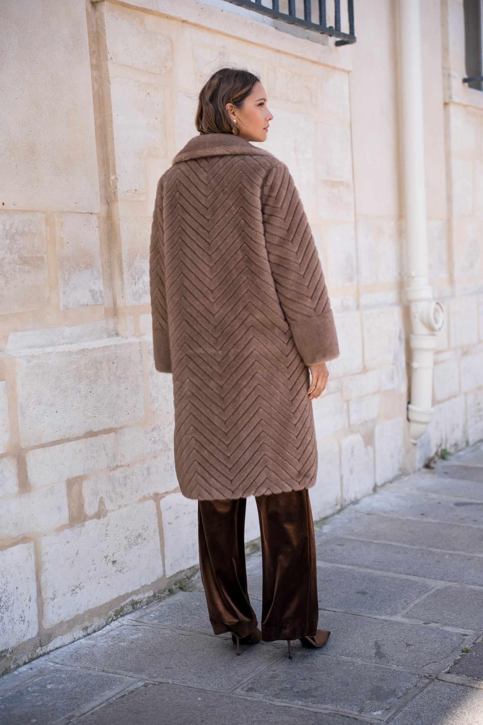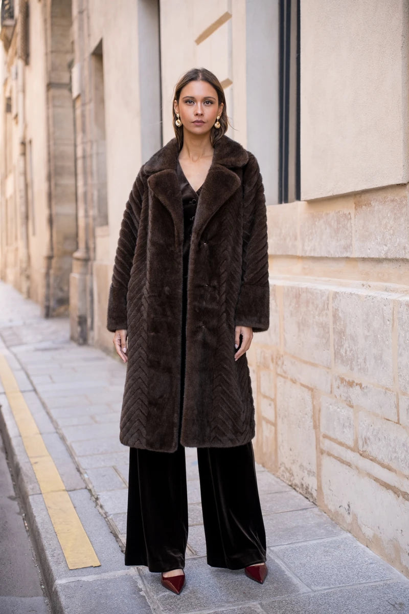 Ein edler Mantel aus Kunstpelz mit weicher, luxuriöser Textur und elegantem, geradem Schnitt. Das dezente Fischgrätmuster verleiht dem Design eine besondere Raffinesse, während der breite Reverskragen und der unsichtbare Frontverschluss für einen klaren, stilvollen Abschluss sorgen. Warm, anspruchsvoll und vielseitig kombinierbar – ein perfekter Begleiter für einen eleganten Winterauftritt.