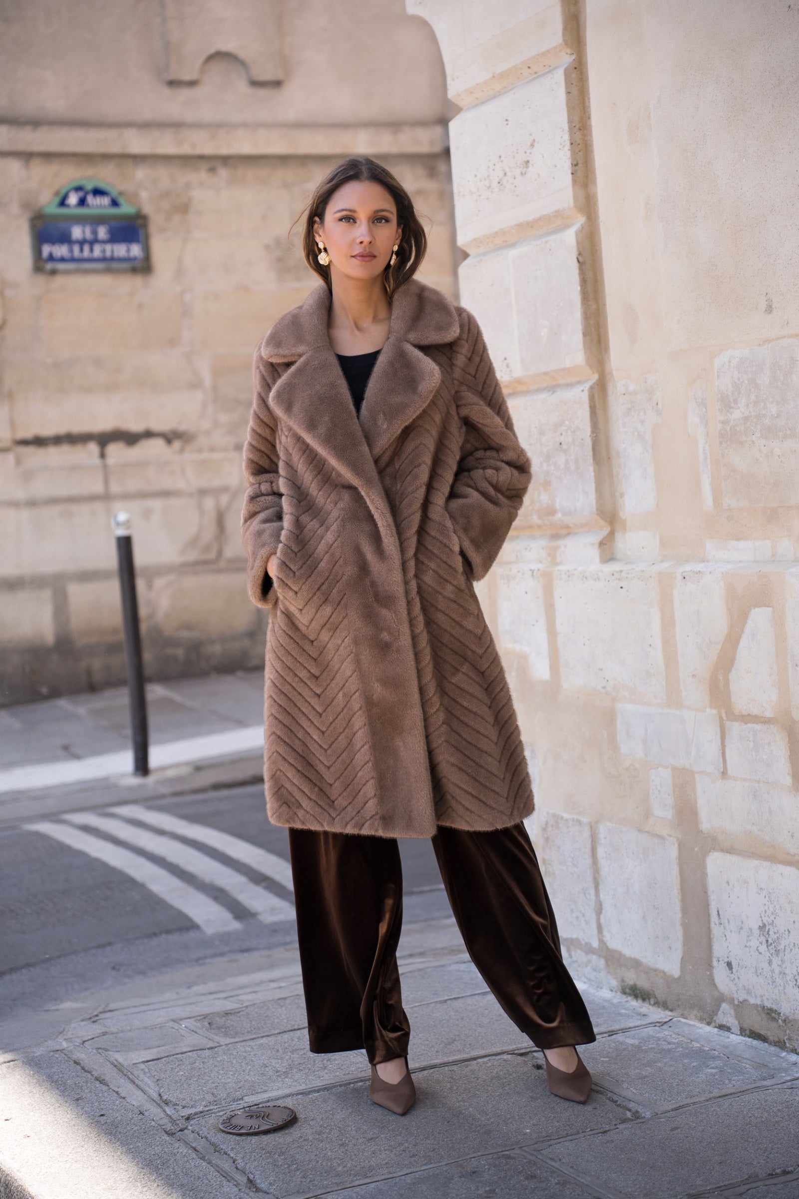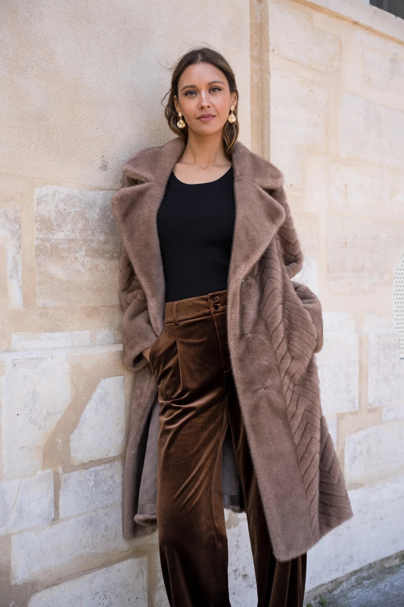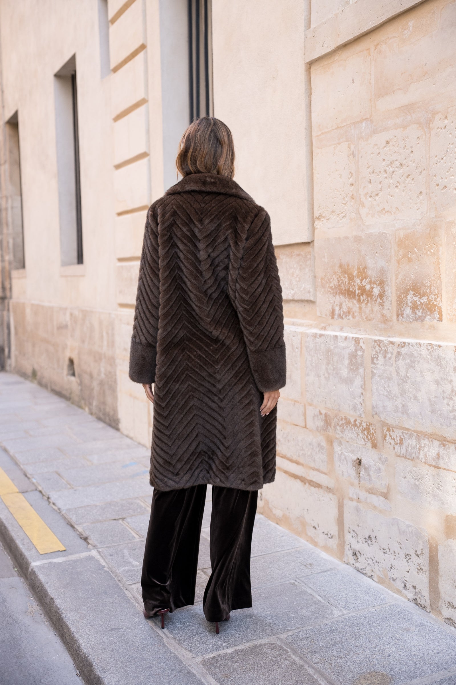 Ein edler Mantel aus Kunstpelz mit weicher, luxuriöser Textur und elegantem, geradem Schnitt. Das dezente Fischgrätmuster verleiht dem Design eine besondere Raffinesse, während der breite Reverskragen und der unsichtbare Frontverschluss für einen klaren, stilvollen Abschluss sorgen. Warm, anspruchsvoll und vielseitig kombinierbar – ein perfekter Begleiter für einen eleganten Winterauftritt.