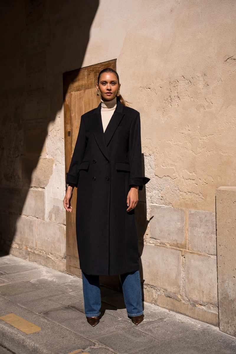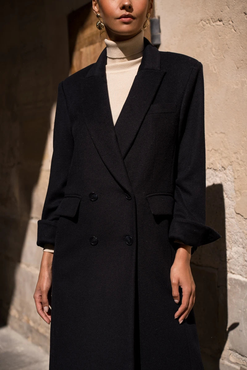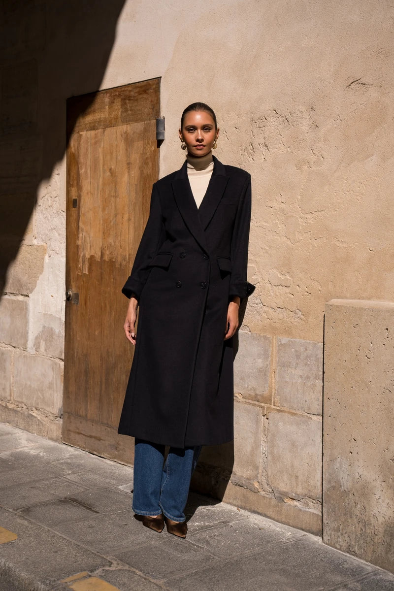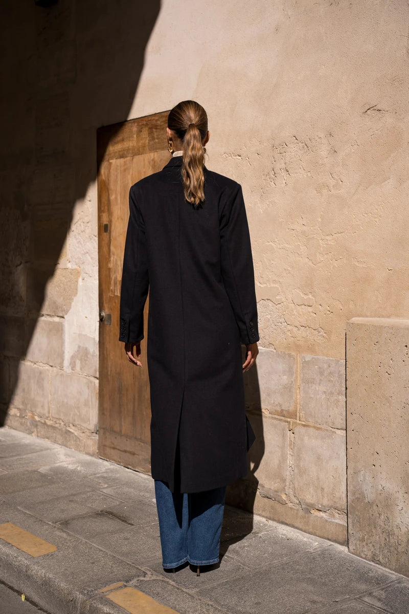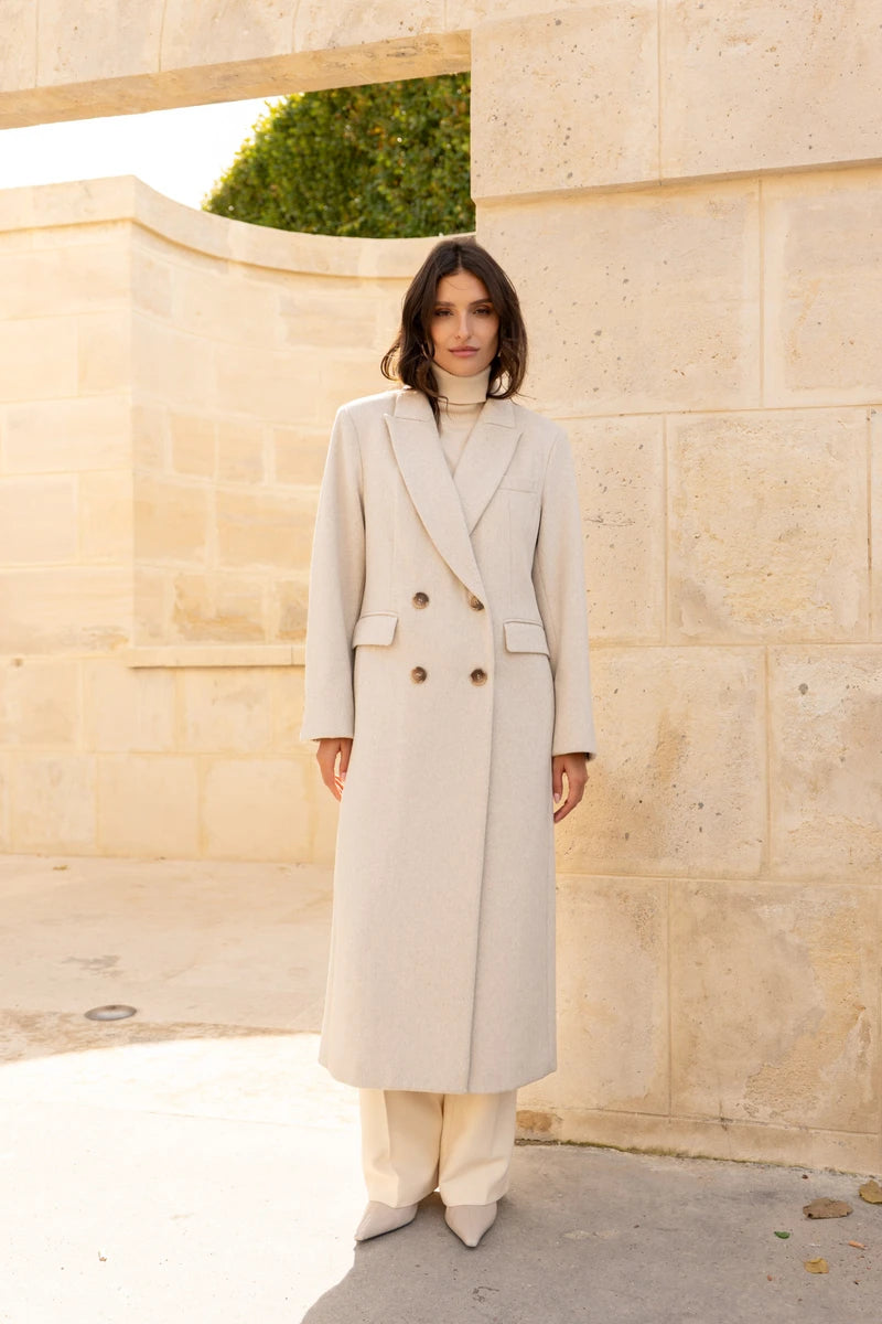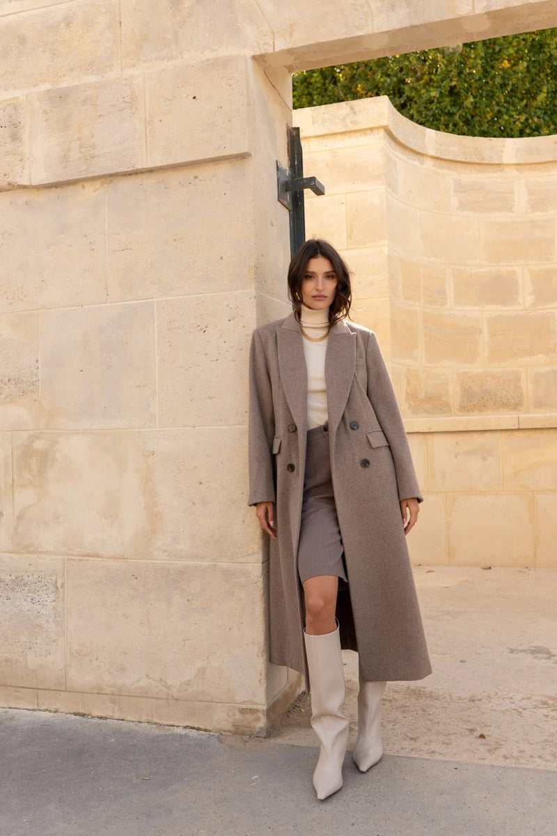 Ein Mantel mit geradem, strukturiertem Schnitt und markanten Schulterpolstern für eine souveräne Silhouette. Klassische Revers und der doppelreihige Knopfverschluss verleihen ihm zeitlose Eleganz. Aus einer hochwertigen Wollmischung gefertigt, kombiniert er wärmenden Komfort mit einem fließenden, anspruchsvollen Design. Perfekt für elegante Business-Looks oder stilvolle Alltagsoutfits.