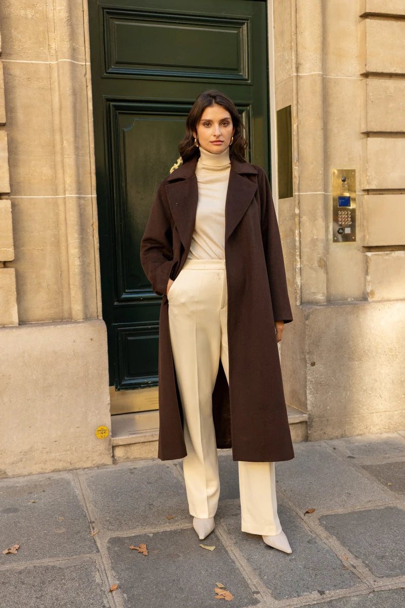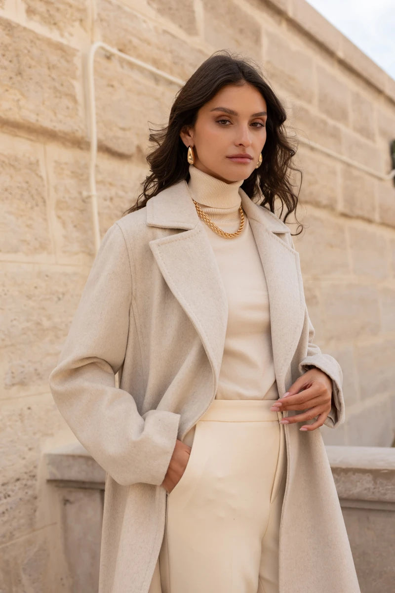 Ein zeitloser Mantel mit fließender, minimalistischer Silhouette. Der klassische Reverskragen und der dezente Verschluss unterstreichen das puristische Design, während der Bindegürtel die Figur auf elegante Weise betont. Gefertigt aus einer hochwertigen Wollmischung, verbindet er angenehme Wärme mit edler Optik. Ob für Business-Looks oder legere Outfits – dieser Mantel ist ein vielseitiger Begleiter, der jedem Auftritt eine stilvolle Note verleiht.