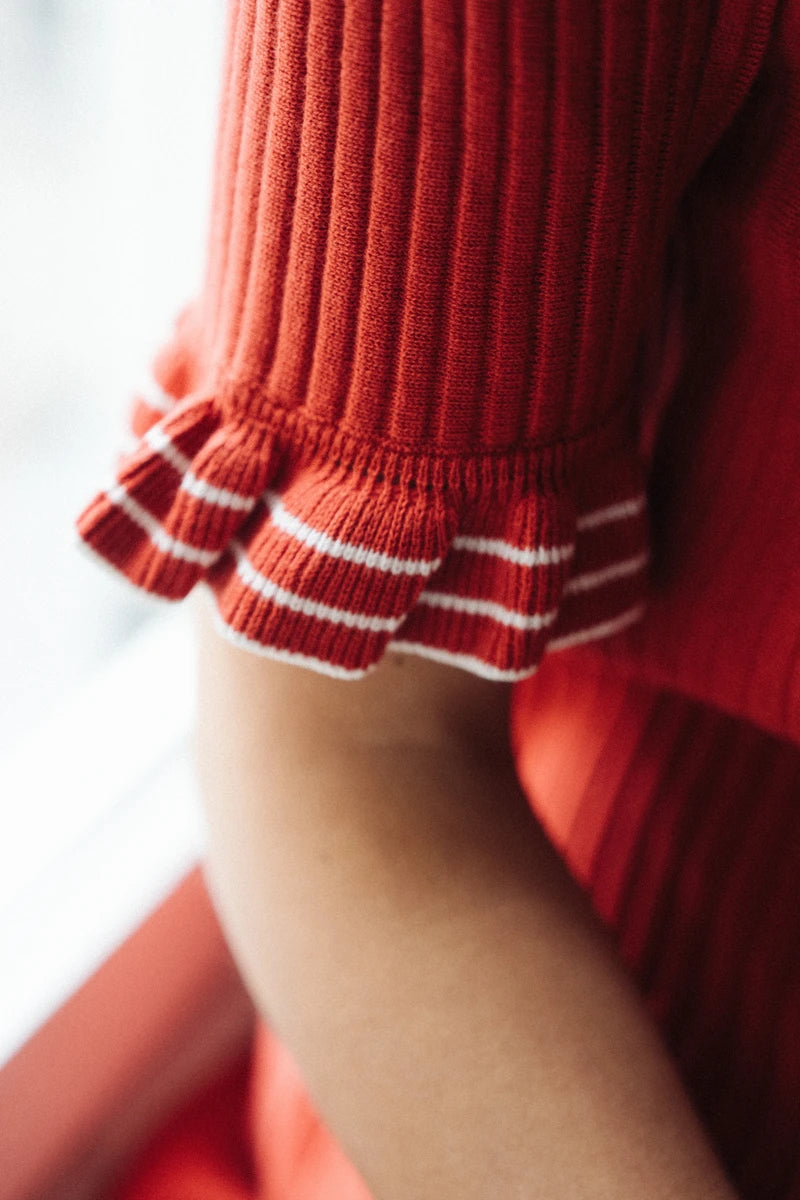 Design: Kurze Ärmel mit gestreiften Rüschen-Abschlüssen.