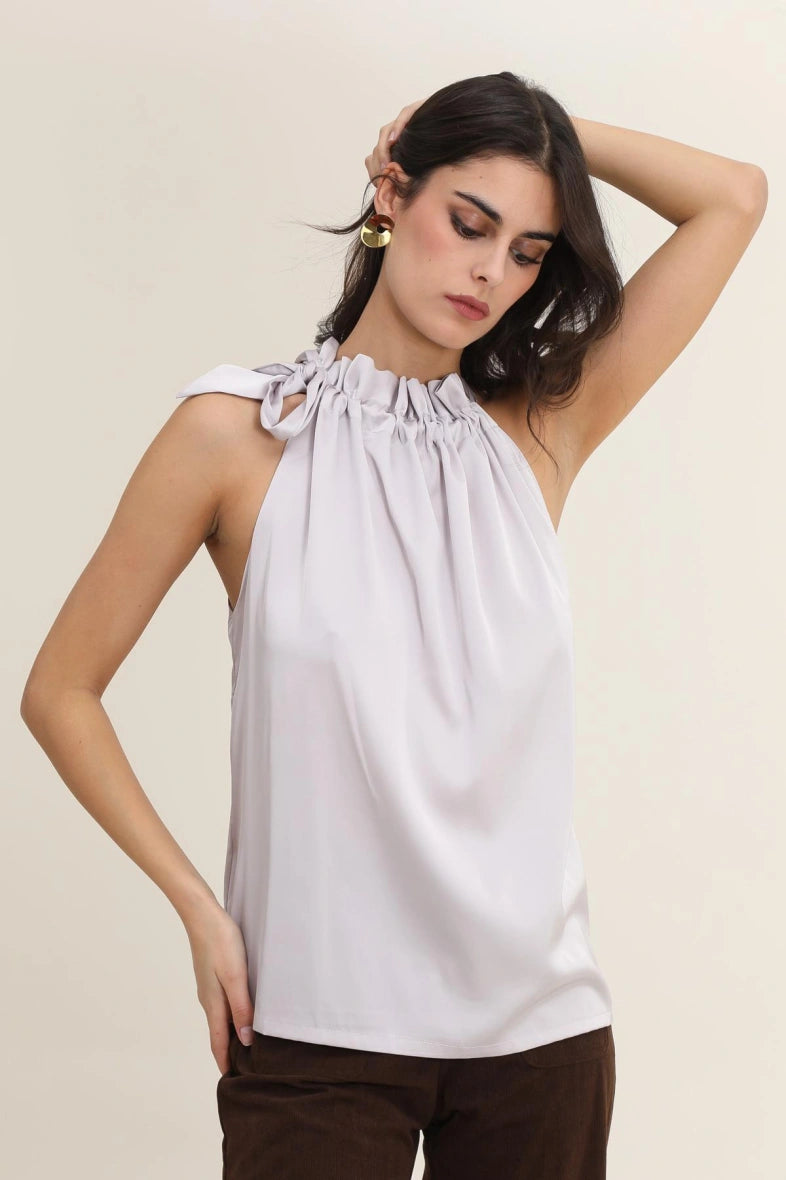 Oberteil aus Polyestersatin, mit hübscher Schleife am Kragen zu binden.