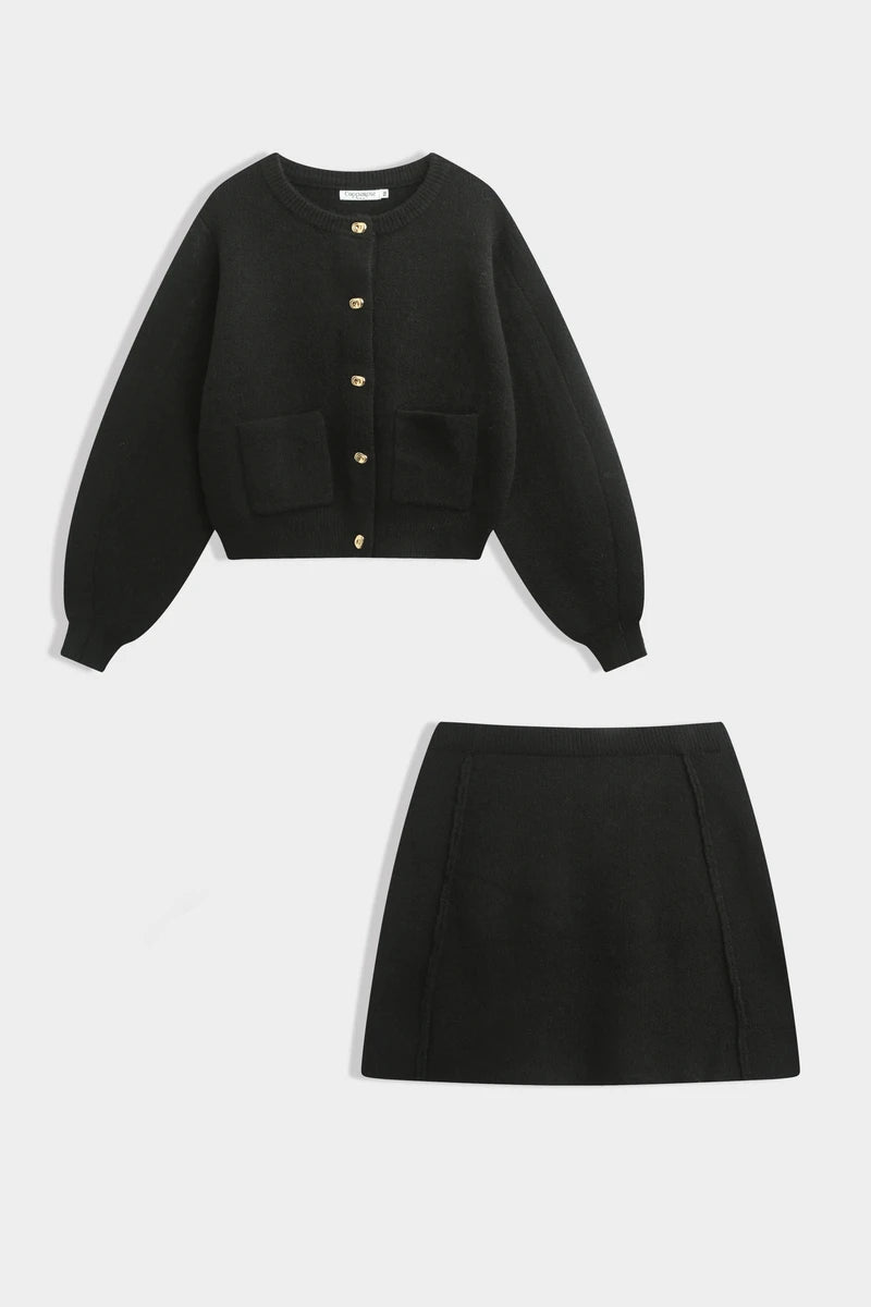 Dazu passend gibt es einen kurzen Strickrock mit geradem Schnitt, der deine Figur elegant in Szene setzt. Der elastische Bund garantiert eine bequeme Passform, und die sichtbaren Nähte vorne verleihen dem Rock eine moderne, strukturierte Optik.