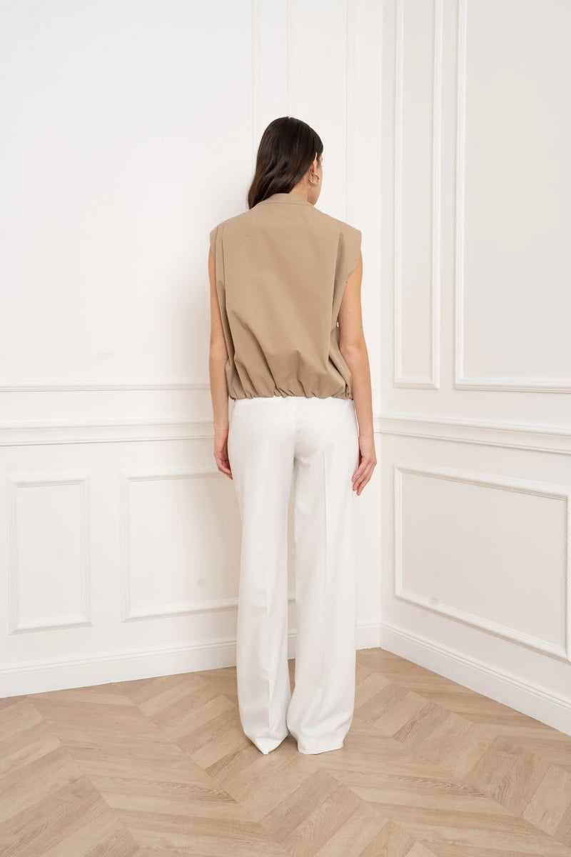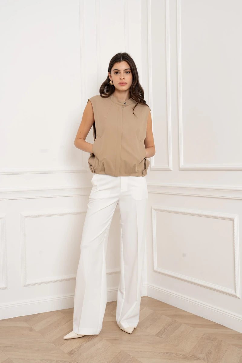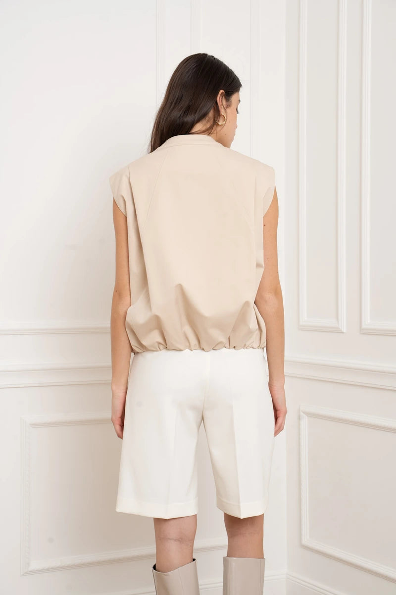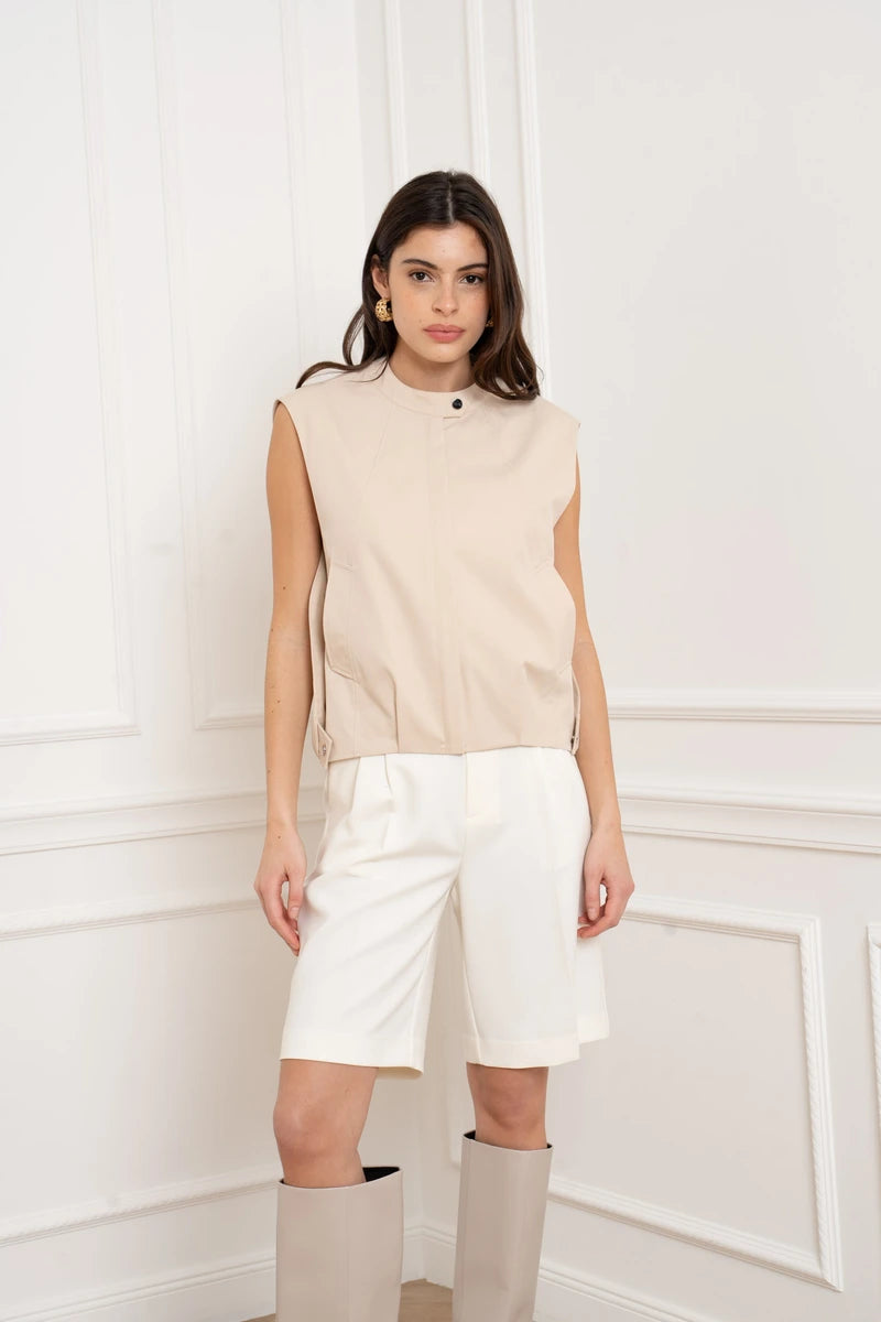 Diese Weste ist das ultimative Layering-Piece für einen progressiven Look. Mit ihrer strukturierten Passform und dem Fokus auf klare Linien interpretiert sie das klassische Bomber-Design völlig neu. Der hohe Stehkragen und der präzise gesäumte Abschluss unterstreichen die architektonische Silhouette. Seitentaschen mit verdeckten Druckknöpfen bewahren die cleane Ästhetik, ohne auf Funktionalität zu verzichten.