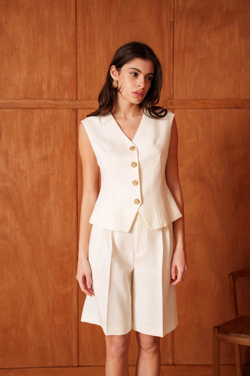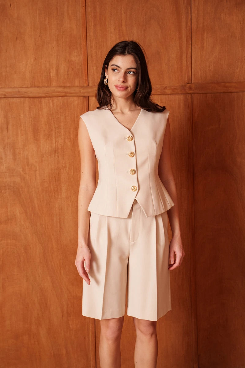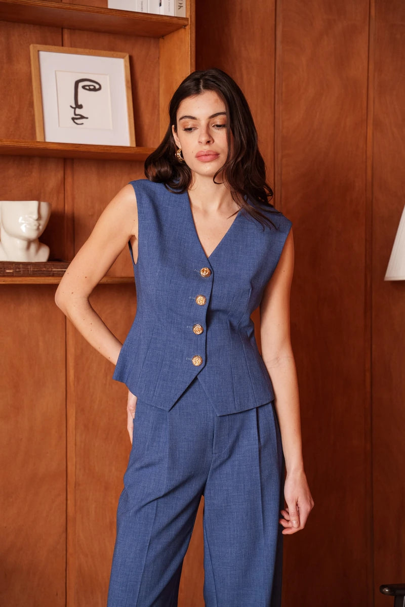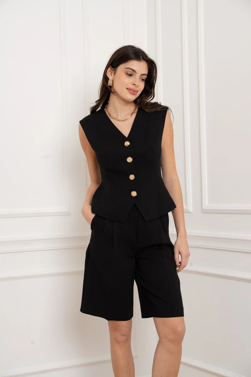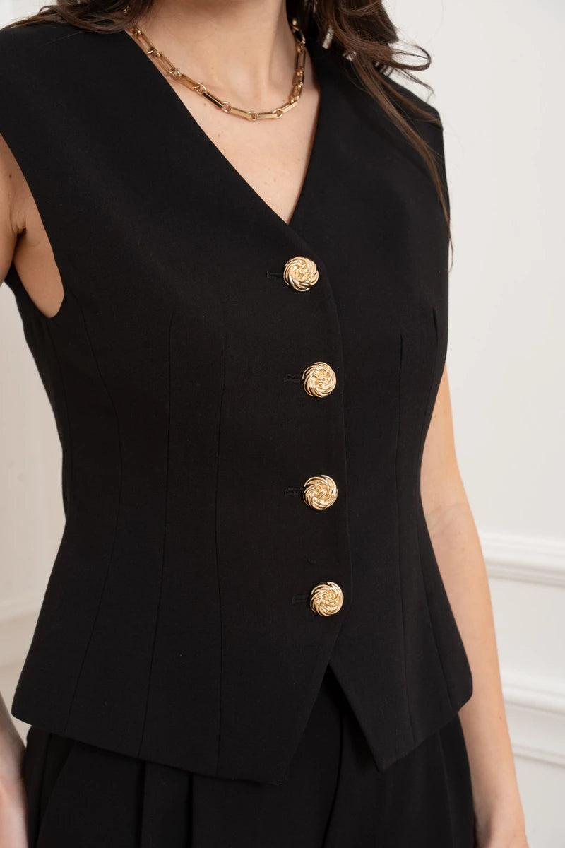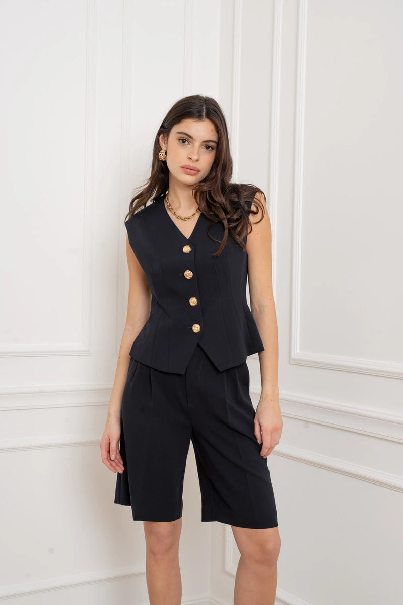 Diese ärmellose Weste ist eine Hommage an die feminine Schneiderkunst. Durch die präzise Linienführung und strategisch gesetzte Wiener Nähte formt sie eine skulpturale, taillierte Silhouette. Der tiefe V-Ausschnitt verleiht dem Design eine feminine Note, während die markanten goldfarbenen Knöpfe für ein luxuriöses Finish sorgen. Ein Key-Piece, das Souveränität und Raffinesse ausstrahlt.
