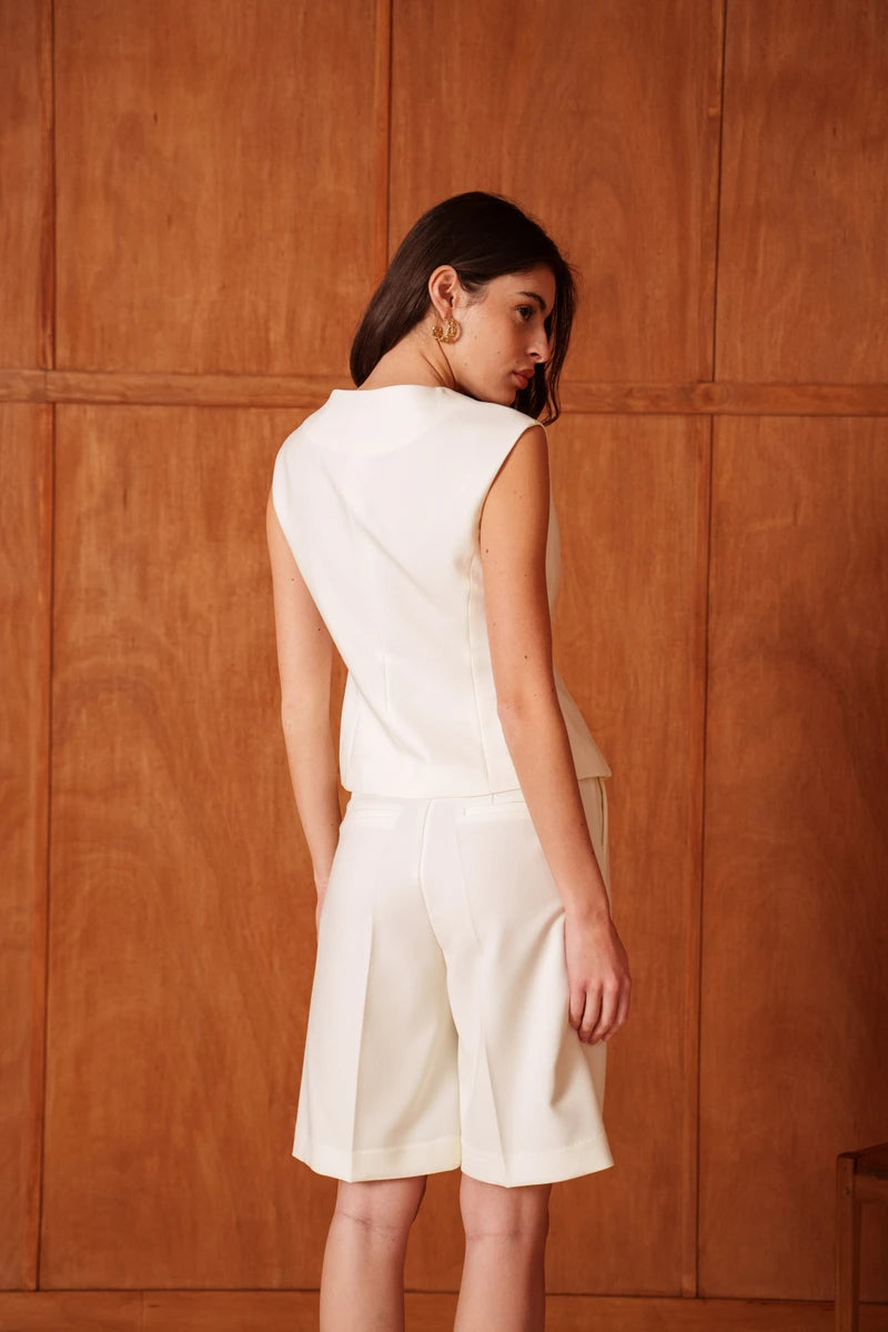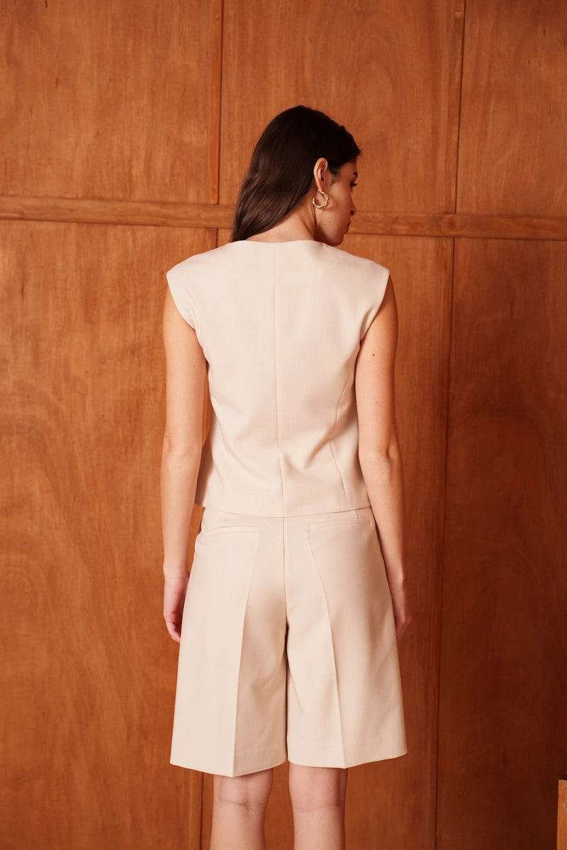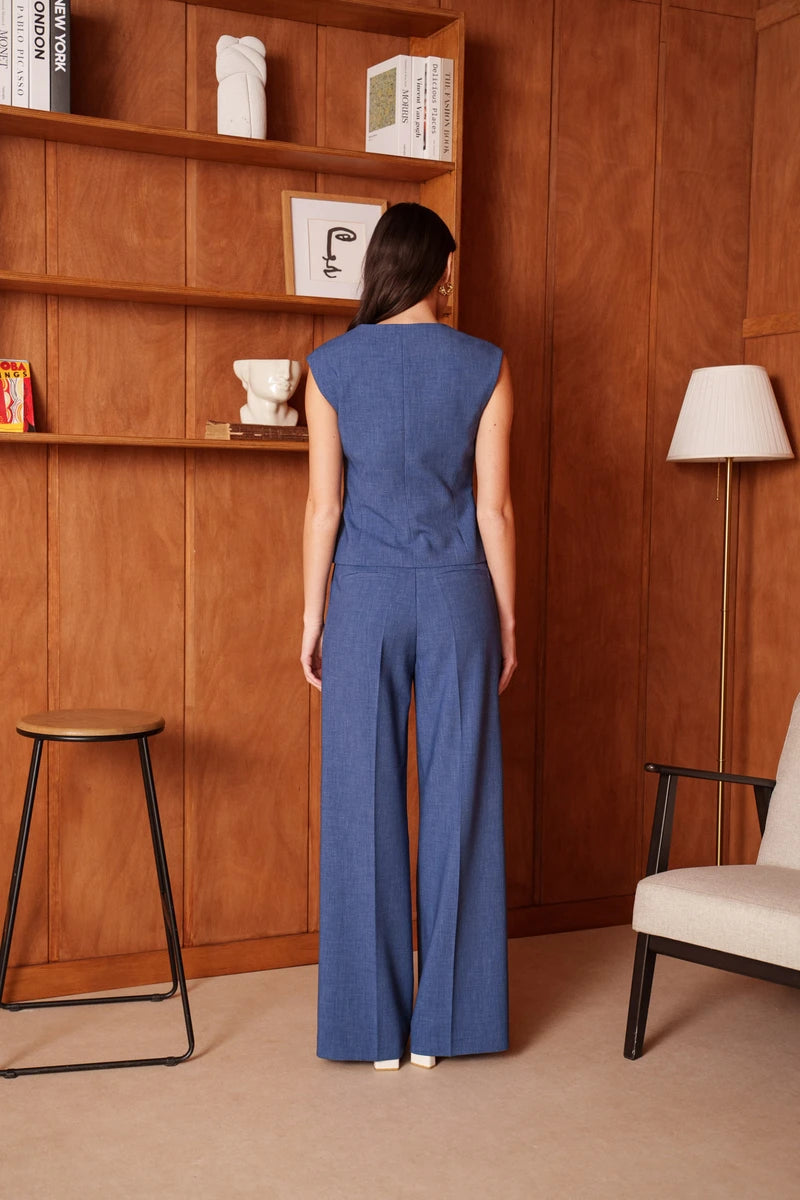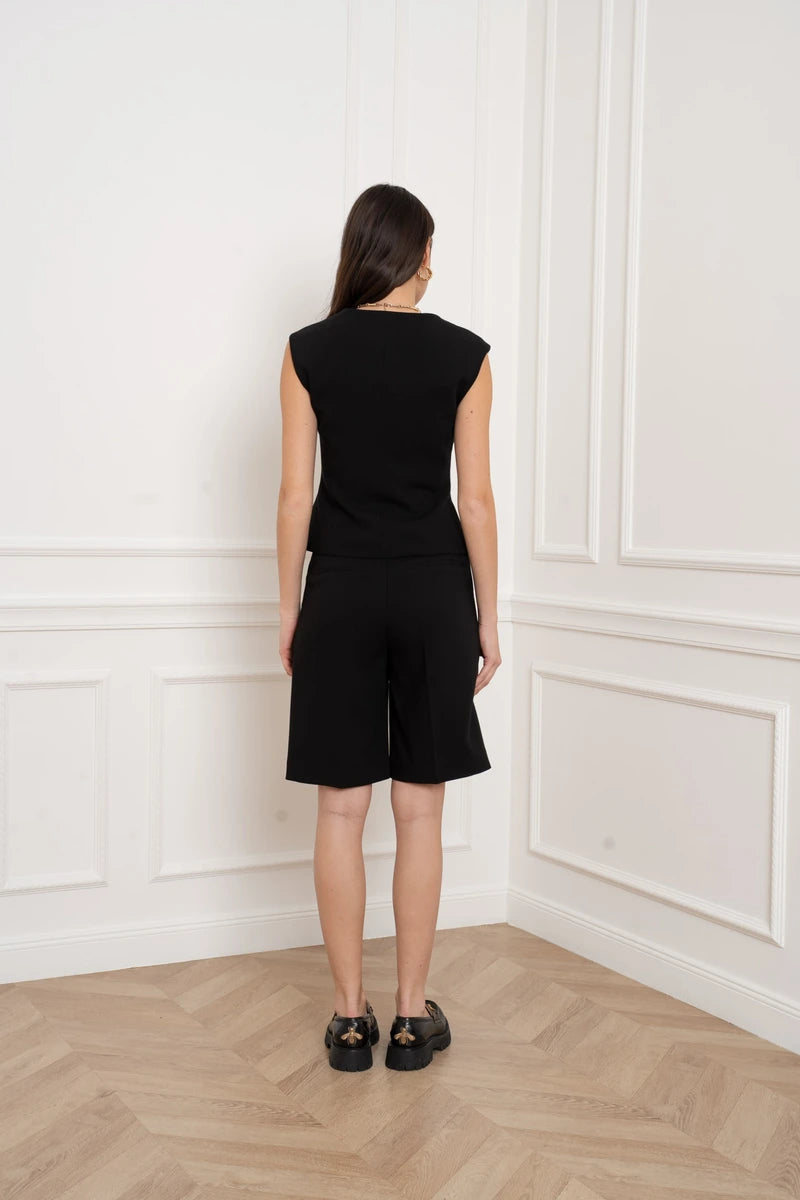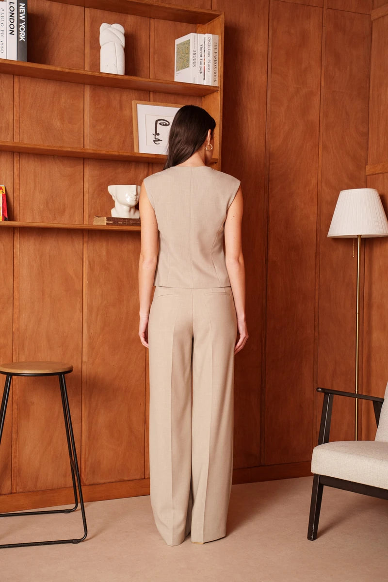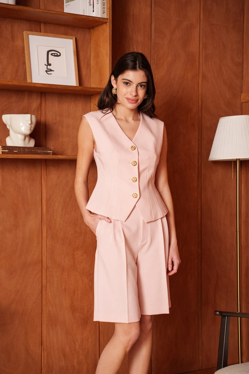 Diese ärmellose Weste ist eine Hommage an die feminine Schneiderkunst. Durch die präzise Linienführung und strategisch gesetzte Wiener Nähte formt sie eine skulpturale, taillierte Silhouette. Der tiefe V-Ausschnitt verleiht dem Design eine feminine Note, während die markanten goldfarbenen Knöpfe für ein luxuriöses Finish sorgen. Ein Key-Piece, das Souveränität und Raffinesse ausstrahlt.